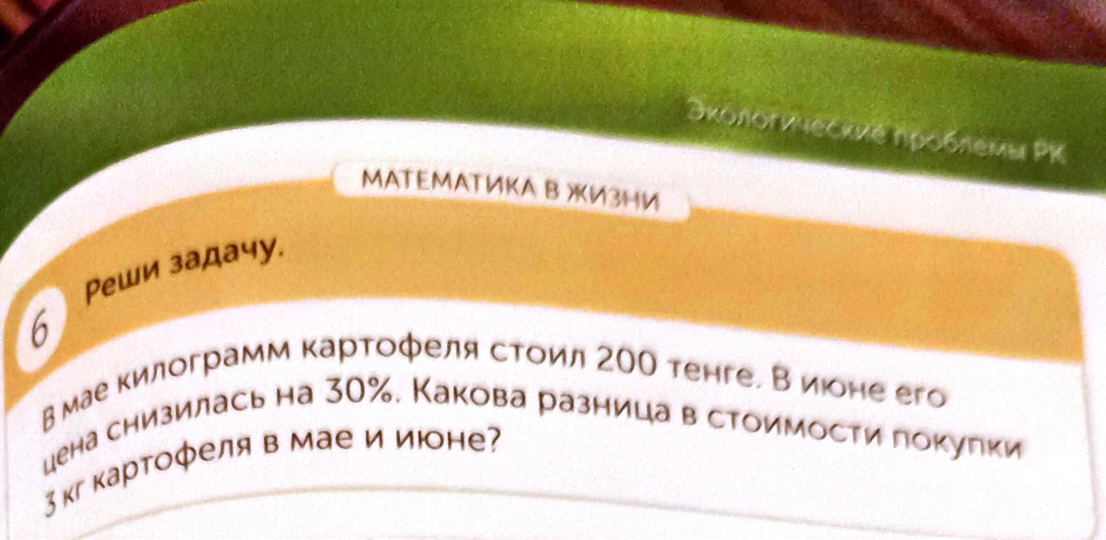 Экологические проблемы РК МАТЕМАТИКА В жизни Реши задачу. 6 ся иде ого цена снизилась на 30%. Какова разница в стоимости Покупки В мае килограмм картофеля Стоил 200 тенге. В июне его В мае и июне? 3 кг картофеля ТВОРЧЕСКАЯ РАБОТА Составь задачу