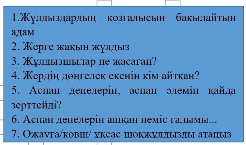 1.Жулдыздардын козгалысын бақылайтын адам 2. Жерге жақын жұлдыз 3. Жулдызшылар не жасаған? 4. Жердің дөңгелек екенін кім айтқан? 5. Аспан денелерін, аспан әлемін кайда зерттейді? 6. Аспан денелерін ашқан неміс ғалымы... 7. Ожауга/ковш/ уксас шокжулдызды атаныз.