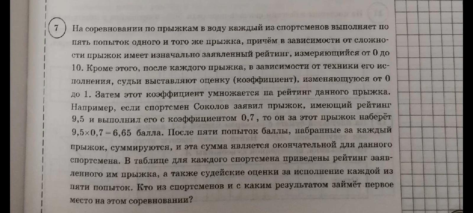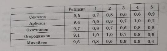 Соколов получит : (0,7+0,8+0,6+0,6+0,9)*9,5=34,2
