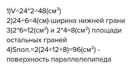 3. Высота прямоугольного па- раллелепипеда равна 2 см, дли- на нижней грани 6 см, пло- щадь этой же грани – 24 кв.см. Вычисли площадь остальных граней параллелепипеда и его объём.