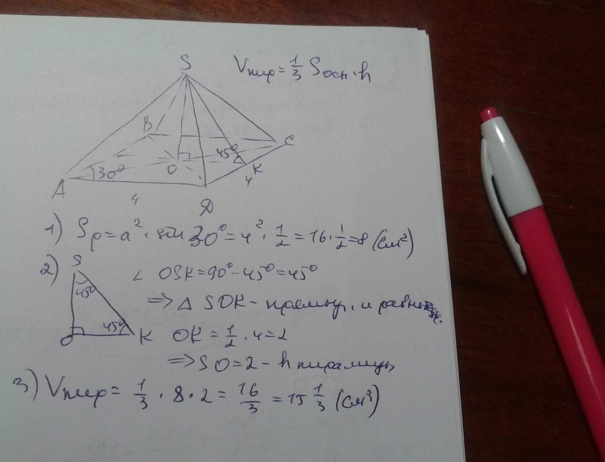 Задана пирамида, в основании которой лежит ромб со стороной 4 см и тупым углом 120°. Все двугранные углы при основании пирамиды равны 60°. Найдите объём пирамиды.
