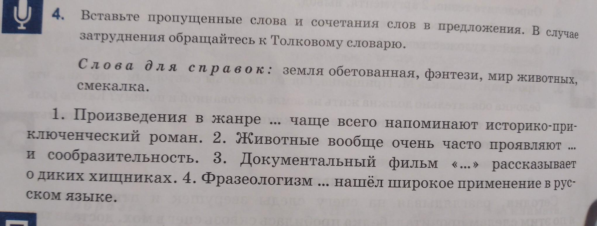 4. Вставьте пропущенные слова и сочетания слов в предложения. В случае, затруднения обращайтесь к Толковому словарю. Слова для справок: земля обетованная, фэнтези, мир животных. смекалка. 1. Произведения в жанре ... чаще всего напоминают историко-при- ключенческий роман. 2. Животные вообще очень часто проявляют и сообразительность. 3. Документальный фильм «...» рассказывает о диких хищниках. 4. Фразеологизм ... нашёл широкое применение в рус- ском языке. помогите пожалуйста