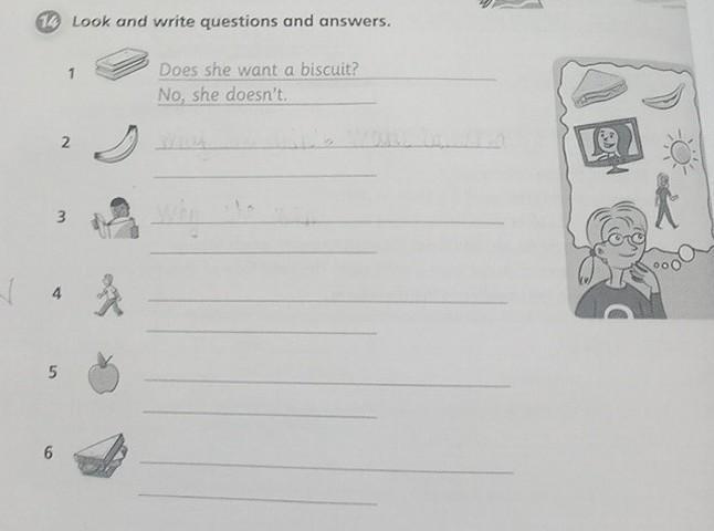 14 Look and write questions and answers. Does she want a biscuit? No, she doesn't 2 3 5 6
