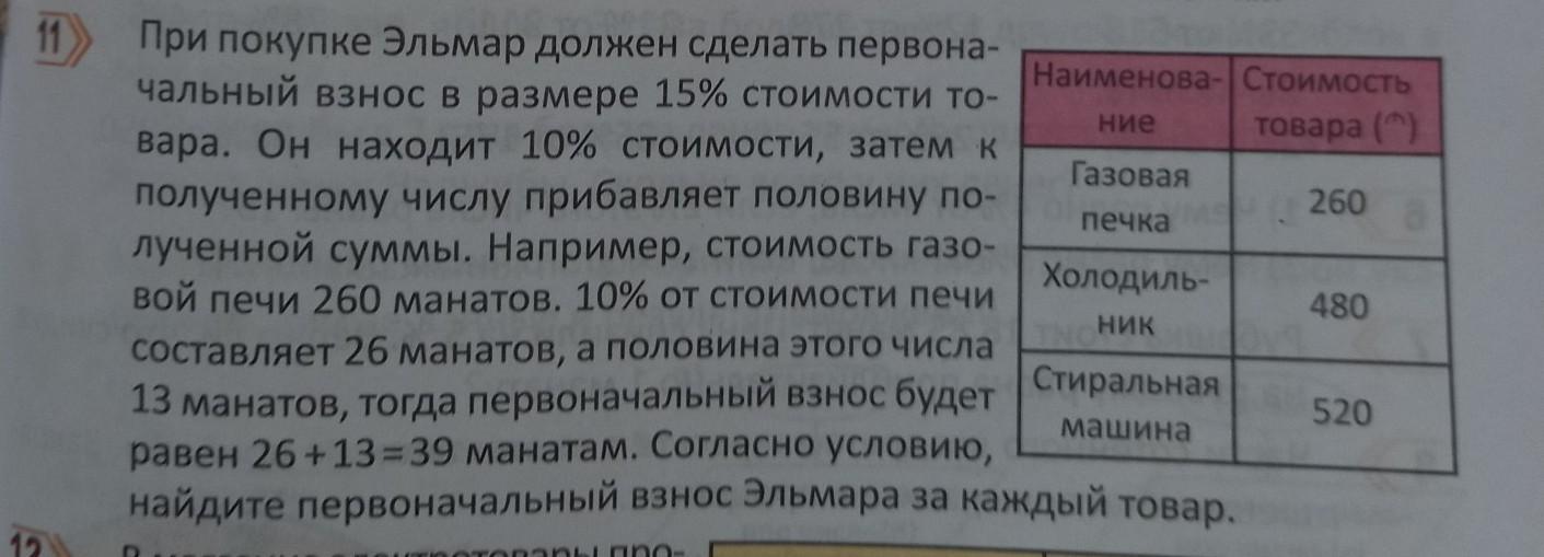 11 Ние 260 Печка ОТ 149 КГ 24% от 254 км При покупке Эльмар должен сделать первона- чальный взнос в размере 15% стоимости то- Наименова-Стоимость вара. Он находит 10% стоимости, затем к товара (" Газовая полученному числу прибавляет половину по- лученной суммы. Например, стоимость газо- Холодиль- вой печи 260 манатов. 10% от стоимости печи составляет 26 манатов, а половина этого числа Стиральная 13 манатов, тогда первоначальный взнос будет равен 26 +13= 39 манатам. Согласно условию, найдите первоначальный взнос Эльмара за каждый товар. 480 НИК 520 машина