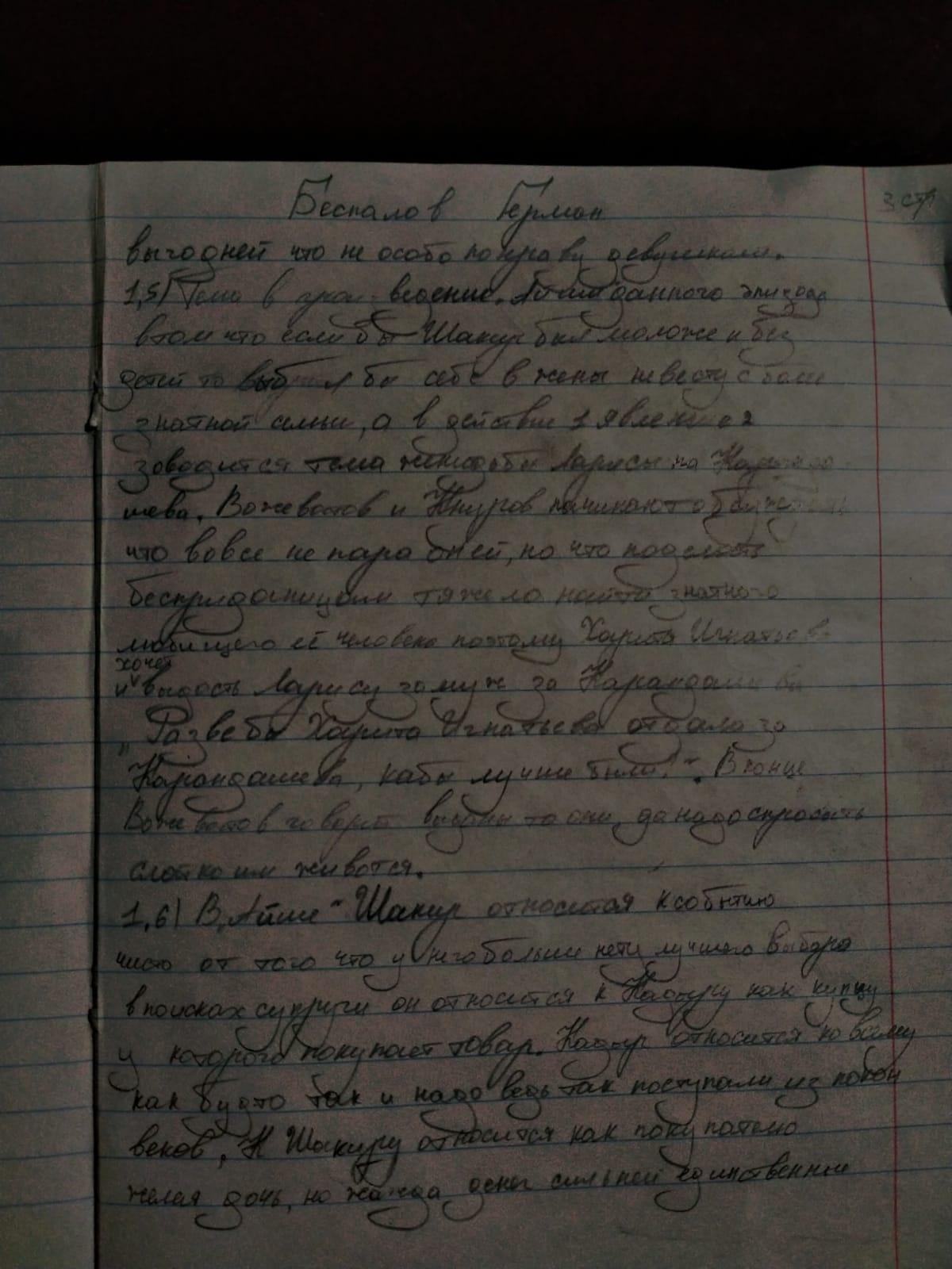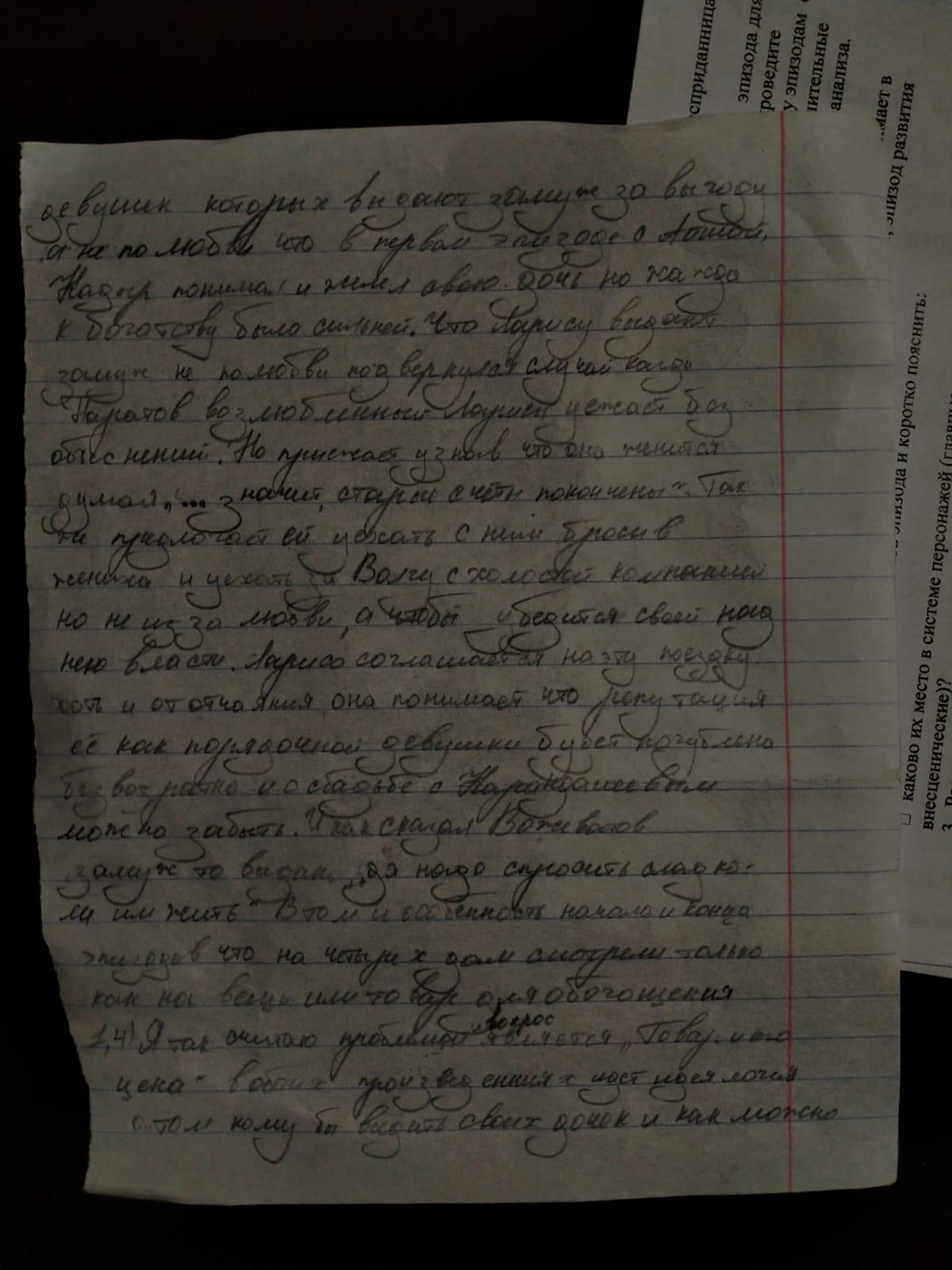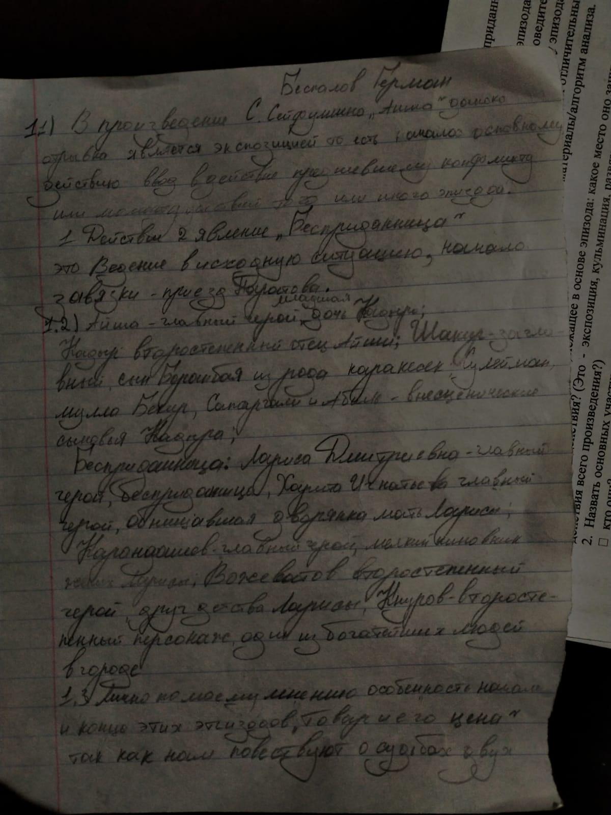 1. Напишите сравнительный анализ эпизодов пьесы Н. А. Островского «Бесприданница» (действие 1, явление 2) и отрывка из повести С. Сейфуллина «Айша». Определите их роль и место в композиции произведения, объясните значение эпизода для раскрытия идейно-тематического замысла. Охарактеризуйте героев эпизода, проведите смысловые параллели (чем персонажи похожи и чем отличаются). Дайте оценку эпизодам с точки зрения эстетического воздействия на читателя, определите общие и отличительные признаки. В ходе работы можете использовать справочные материалы/алгоритм анализа. Анализ Эпизода