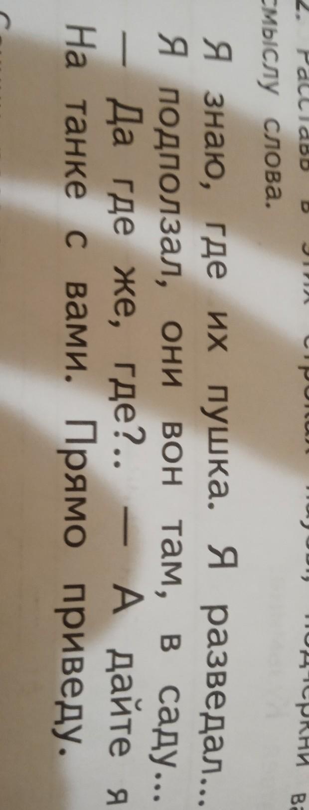 Расставь в этих строках паузы подчеркни важные по смыслу слова Я знаю где их пушка Я разве дал и я опоздал они вон там в саду Так где же где Отдайте Я поеду на танке своим прямо приведу