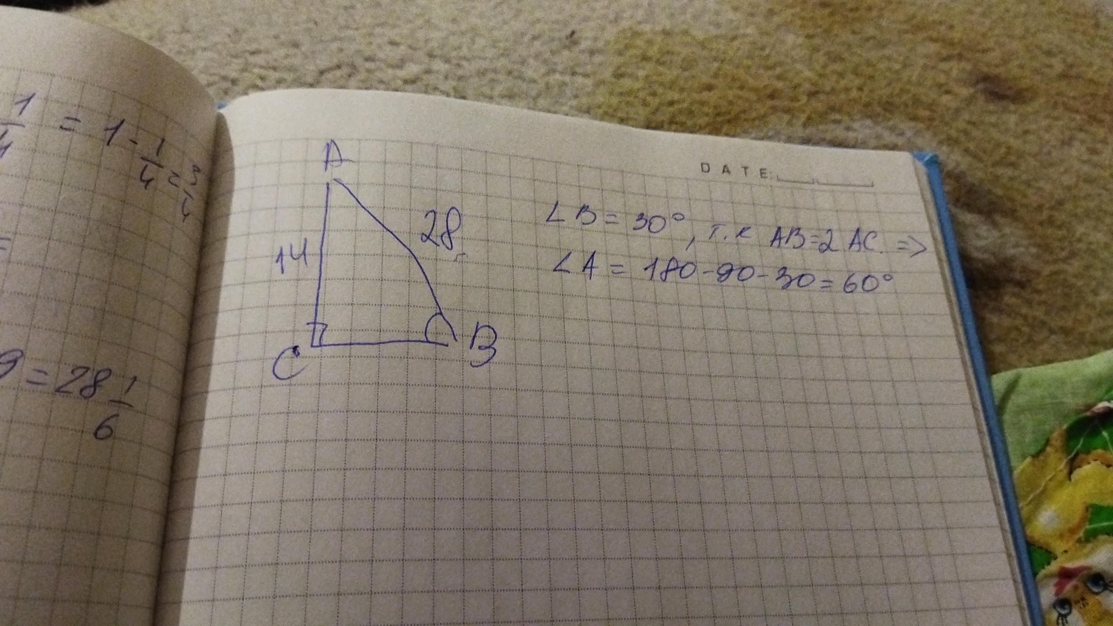 можно. катет, лежащий напротив угла в 30 градусов , вдвое меньше гипотенузы. значит угол в=30. соответственно, а =180-90-30