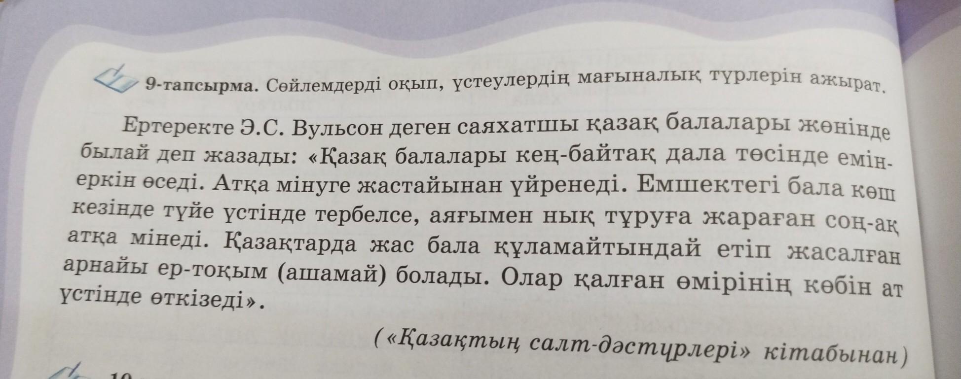 9-тапсырма. Сөйлемдерді оқып, үстеулердің мағыналық түрлерін ажырат. Ертеректе Э.С. Вульсон деген саяхатшы қазақ балалары жөнінде былай деп жазады: «Қазақ балалары кең-байтақ дала төсінде емін- еркін өседі. Атқа мінуге жастайынан үйренеді. Емшектегі бала көш кезінде түйе үстінде тербелсе, аяғымен нық тұруға жараған соң-ақ атқа мінеді. Қазақтарда жас бала құламайтындай етіп жасалған арнайы ер-тоқым (ашамай) болады. Олар қалған өмірінің көбін ат үстінде өткізеді». nima.