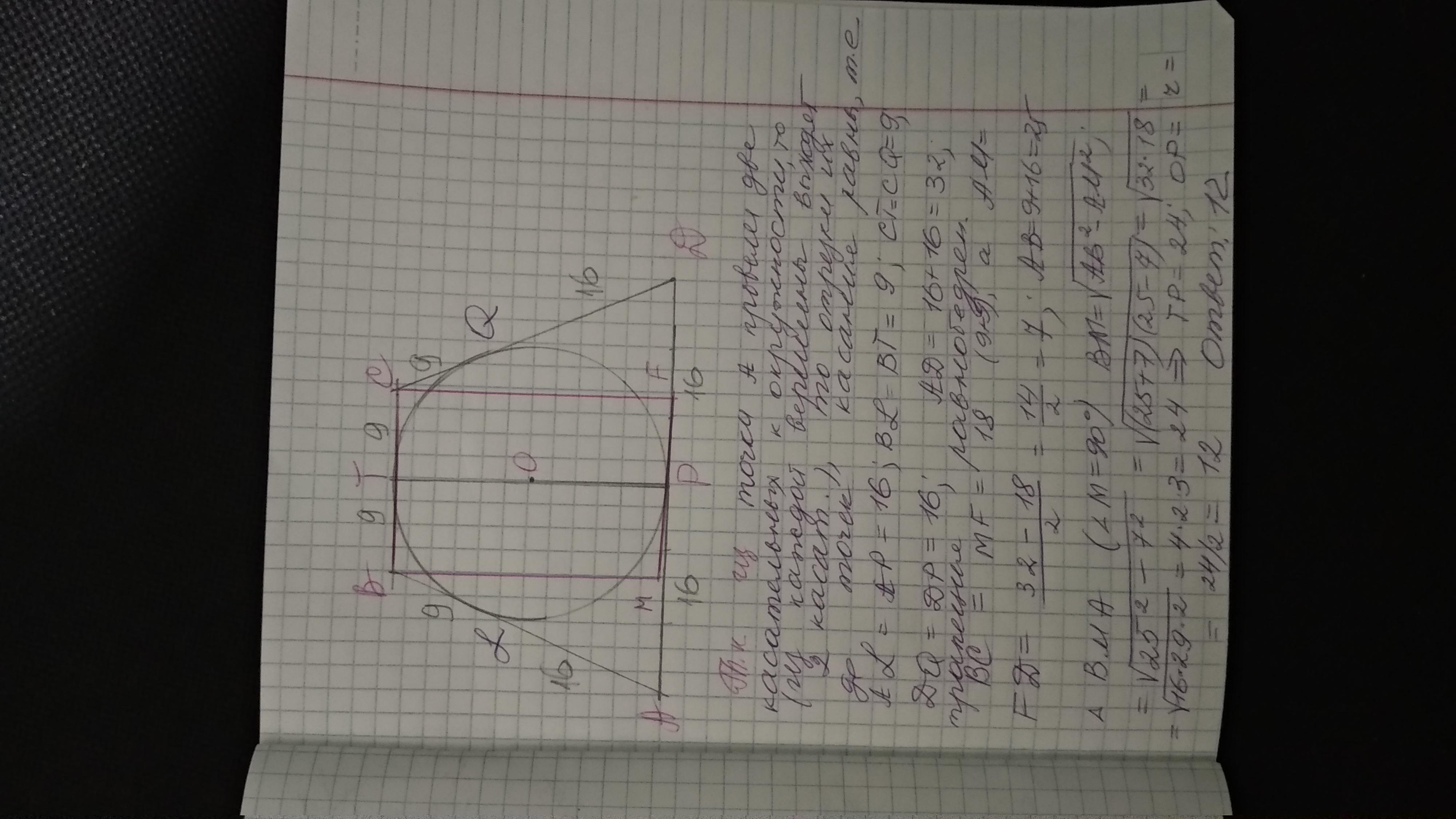 Вписанная в трапецию окружность точкой касания делит боковую сторону на отрезки 9 и 16 . Определи радиус окружности.