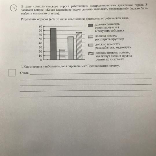 Наибольшая доля опрошенных ответила, что телевидение должно помогать ориентироваться в текущих событиях. По телевизору могут идти новости, игры, музыка на текущий день. Если допустим, что человек не будет знать о происходящих событиях, то в обществе он будет растерянный и не сможет поддержать разговор, или просто не зная о событиях на сегодняшний день, может привести к худшему исходу. Поэтому следует иногда смотреть или слушать телевизор)