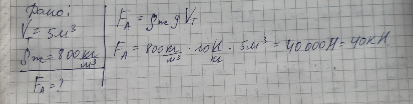 вычислите выталкивающую силу действующую на тело объемом 5 м³ в спирте. ( плотность спирта 800 кг/м³