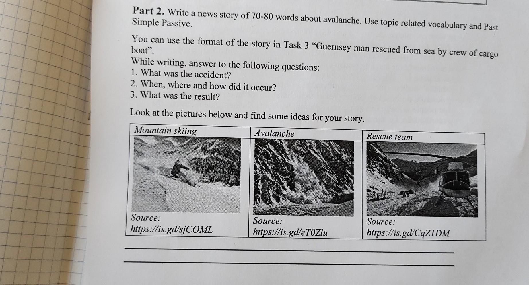 Part 2. Write a news story of 70-80 words about avalanche. Use topic related vocabulary and Past Simple Passive. You can use the format of the story in Task 3 “Guernsey man rescued from sea by crew of cargo boat". While writing, answer to the following questions: 1. What was the accident? 2. When, where and how did it occur? 3. What was the result? Look at the pictures below and find some ideas for your story.