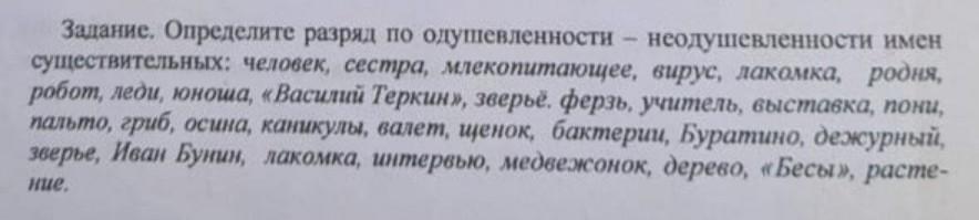 Неодушевленные: вирус**, родня, "Василий Теркин" (произведение), зверье, выставка, пальто, гриб, осина, каникулы, интервью, дерево, "Бесы" (произведение), растение.