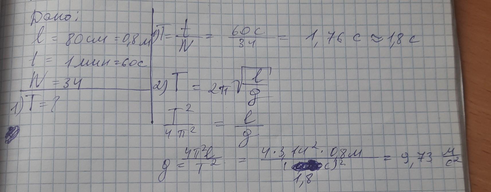 БЫСТРО ОТВЕТИТ. 4. При выполнении лабораторной работы ученик измерил, что маятник длиной 80 см совершил за 1 мин 34 колебания? 1. Вычислите период колебаний математического маятника (0) 2. Выразите ускорение свободного падения из формулы периода колебаний математического маятника (1) 3. Вычислите по полученной формуле ускорение свободного падения