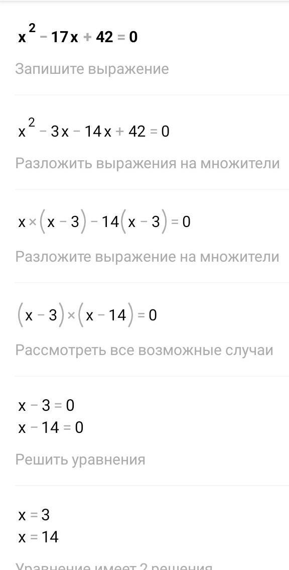 по т Виета х1+х2=17 , х1*х2=42 => х1=3, х2=14