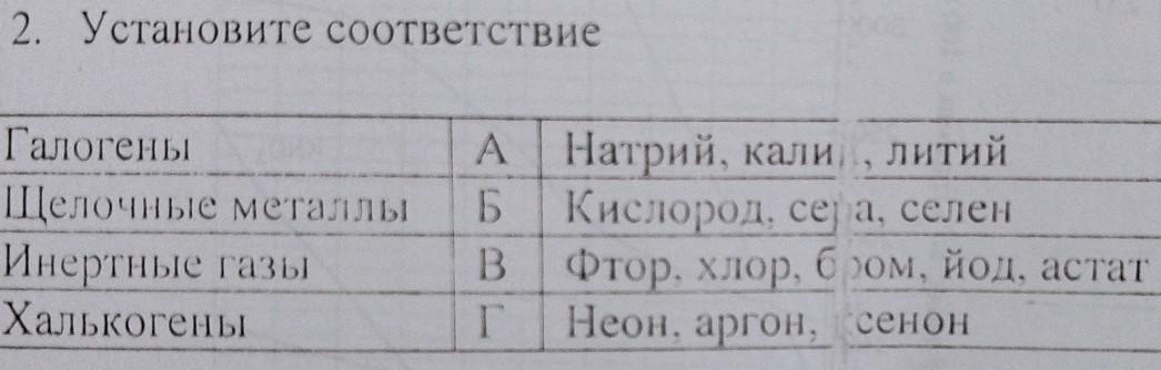 Установите соответствие 1 2 Щелочные металлы Галогены А Натрий, кали литий 3 Инертные газы B Б Кислород. се а, селен Фтор, хлор, бром, йод, астат 4 Халькогены