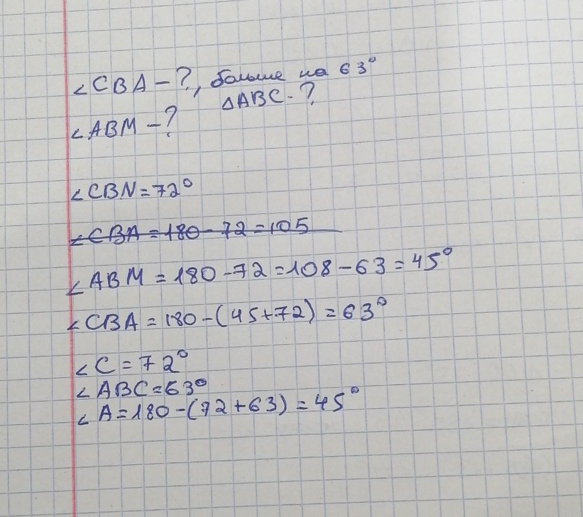 на рисунке дано CBA больше ABM на 63°. Найдите углы треугольника ABC.