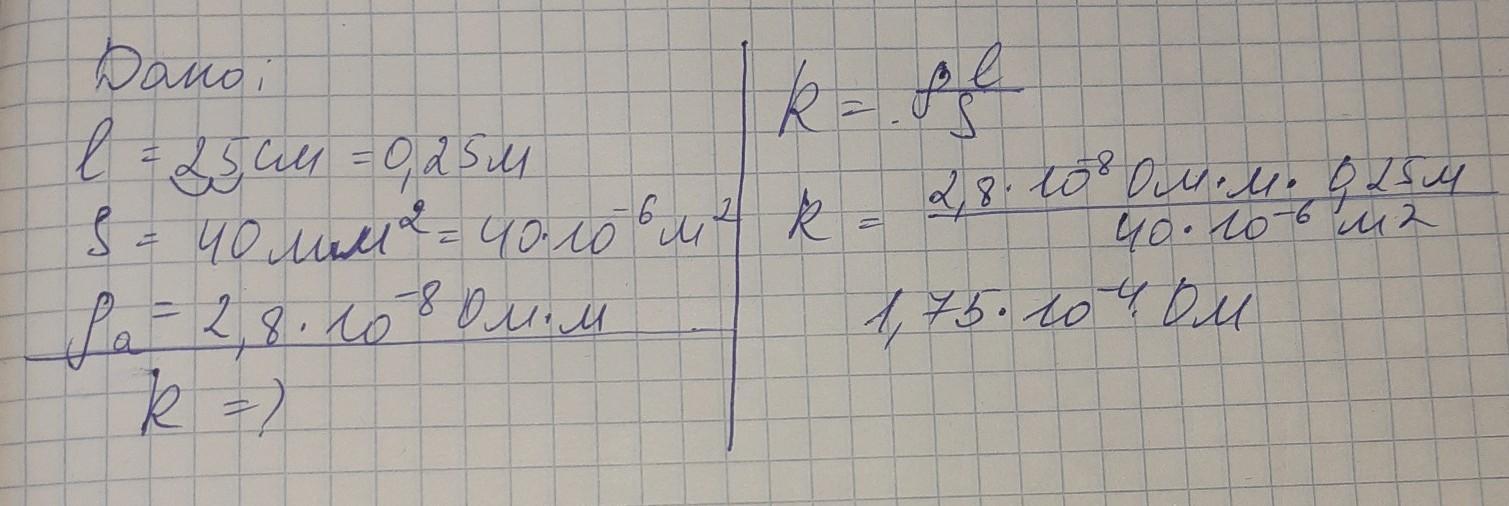 5.Проводник сделан из алюминия, имеет длину 25 см и площадь поперечного сечения 40 мм. (Удельное сопротивление алюминия равно 2,8-10% Омм). Определите сопротивление проводника