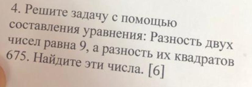 1. Решите задачу с помощью составления уравнения. Разность двух чисел равна 9, а разность их квадратов 675. Найдите эти числа