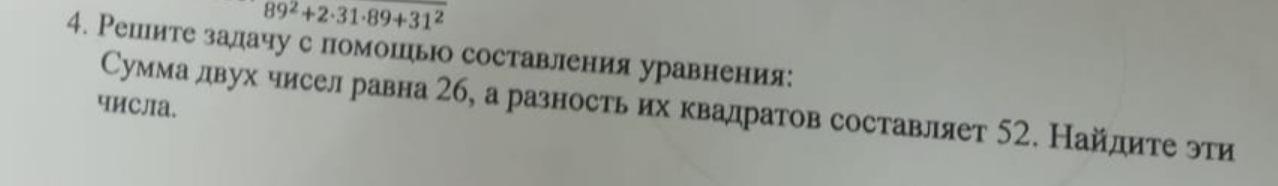 2. Решите задачу с помощью составления уравнения. Сумма двух чисел равна 26, а разность их квадратов составляет 52. Найдите эти числа