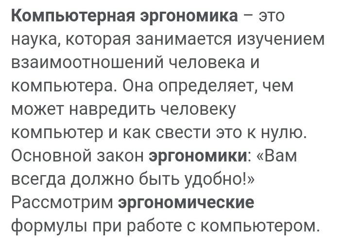 Компьютерная эргономика – это наука, которая занимается изучением взаимоотношений человека и компьютера. Она определяет, чем может навредить человеку компьютер и как свести это к нулю. Основной закон эргономики: «Вам всегда должно быть удобно!» Рассмотрим эргономические формулы при работе с компьютером.