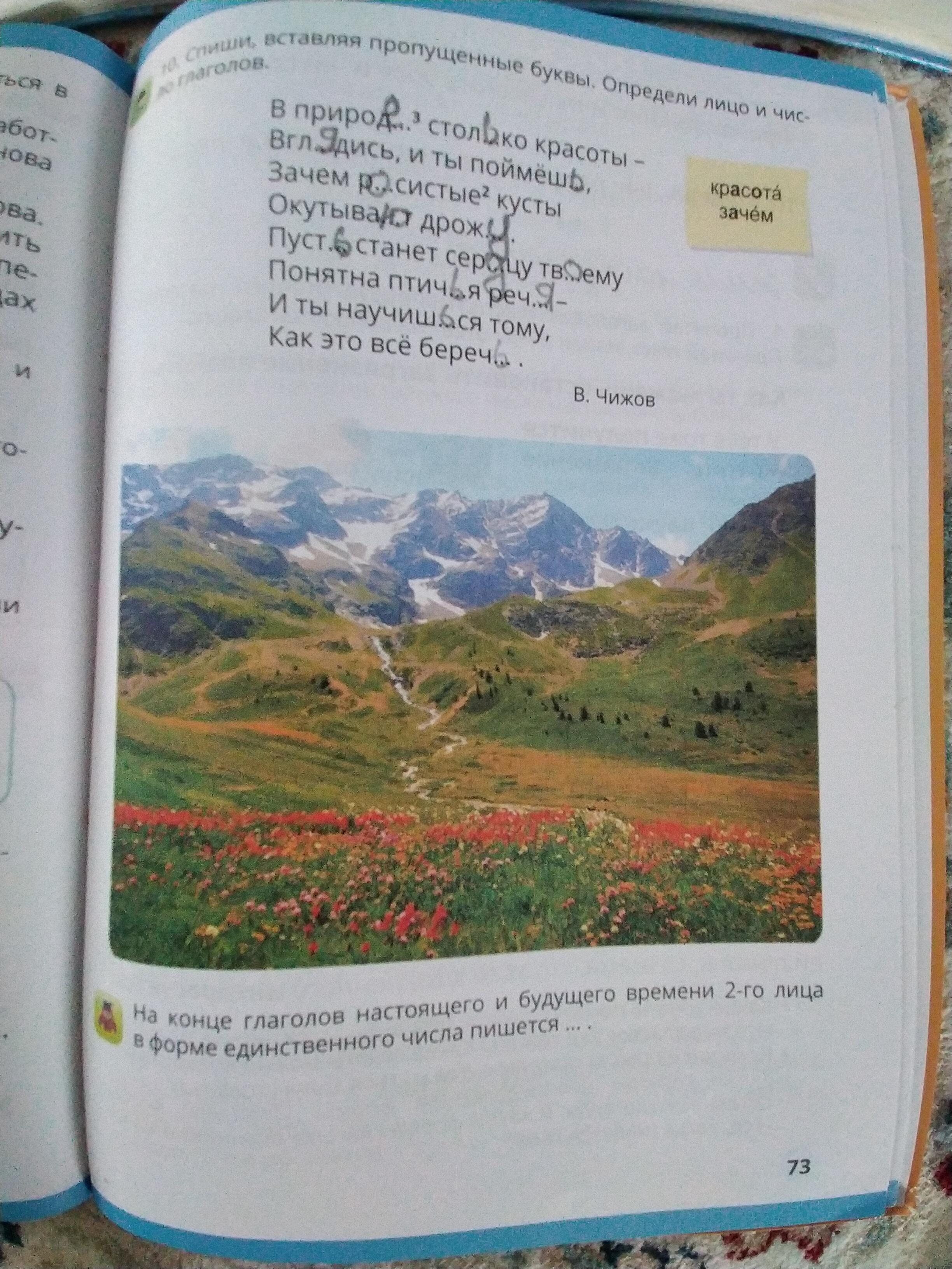 Спиши, вставляя пропущенные буквы. Определи лицо и число глаголов. На конце глаголов настоящего и будущего времени 2-го лица в форме единственного числа пишется ... .