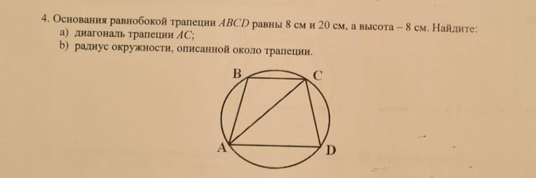 основания равнобедренной трапеции ABCD равны 8 см и 20 см а высота -8см найдите а) диагональ трапеции AC б) радиус окружности описаной около трапеции