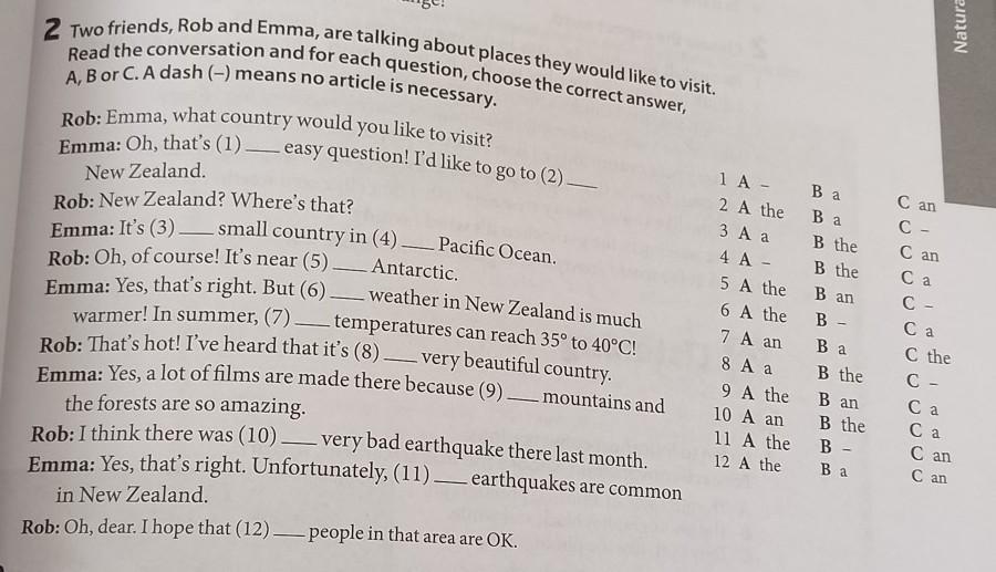 Ca ain. 2 Two friends, Rob and Emma, are talking about places they would like to visit. Read the conversation and for each question, choose the correct answer, A, B or C. A dash (-) means no article is necessary. Rob: Emma, what country would you like to visit? Emma: Oh, that's (1)— easy question! I'd like to go to (2) 1 А - Ba Can 2 A the Ba C- New Zealand. 3 Aa B the C an Rob: New Zealand? Where's that? 4 A - B the Emma: It's (3) — small country in (4) — Pacific Ocean. 5 A the Ban C- Rob: Oh, of course! It's near (5) - Antarctic. 6 A the B - Ca - weather in New Zealand is much Emma: Yes, that's right. But (6) 7 A an C the warmer! In summer, (7)— temperatures can reach 35° to 40°C! 8 A a B the C- Rob: That's hot! I've heard that it's (8) — very beautiful country. 9 A the B an Ca 10 A an B the Ca Emma: Yes, a lot of films are made there because (9) — mountains and 11 A the B Can the forests are so amazing. 12 A the C an Rob: I think there was (10) — very bad earthquake there last month. Emma: Yes, that's right. Unfortunately, (11) — earthquakes are common in New Zealand. Rob: Oh, dear. I hope that (12)— people in that area are OK. Ba Ba