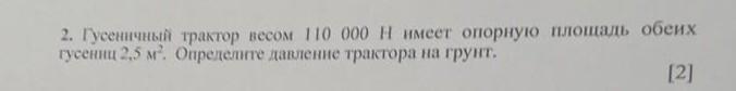 2 Гусеничный трактор весом 110 000 Н имеет опорную плошадь обеих гусениц 2.5 м. Определите давление трактора на грунт. [2]