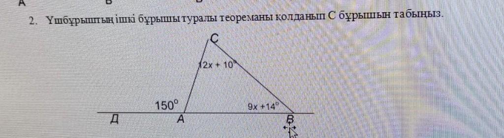 ∠САВ=180°-150°=30° (как смежные). ∠А+∠В+∠С=180°. Тогда получим уравнение 30°+12х+10°+9х+14°=180°