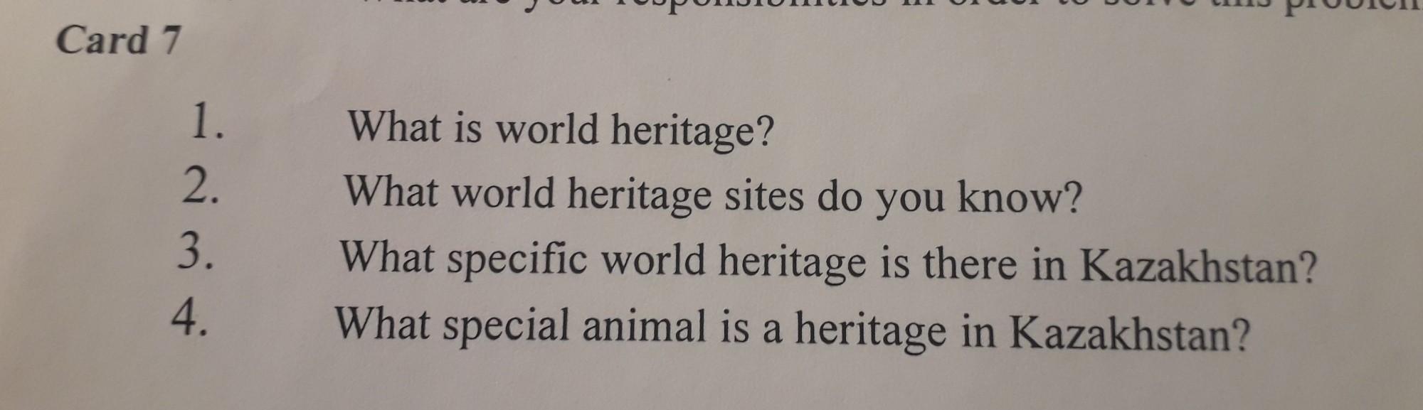Что такое всемирное наследие? какие объекты всемирного наследия вы знаете? какое конкретное всемирное наследие есть в Казахстане? какое особенное животное является наследием в Казахстане?