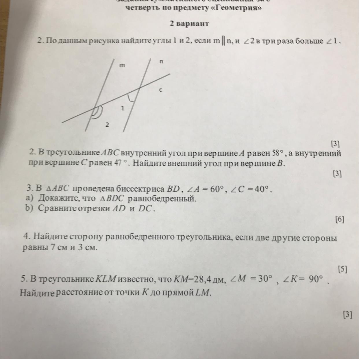 2. В треугольнике ABC внутренний угол при вершине А равен 58°, а внутренний