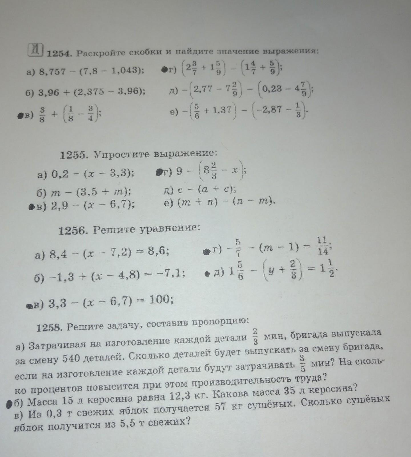 1254. в) 3/8 + (1/8 - 3/4) = 3/8 + 1/8 - 6/8 = 4/8 - 6/8 = -2/8 = -1/4