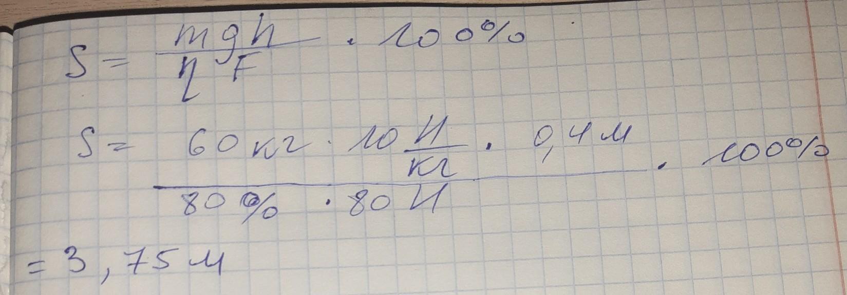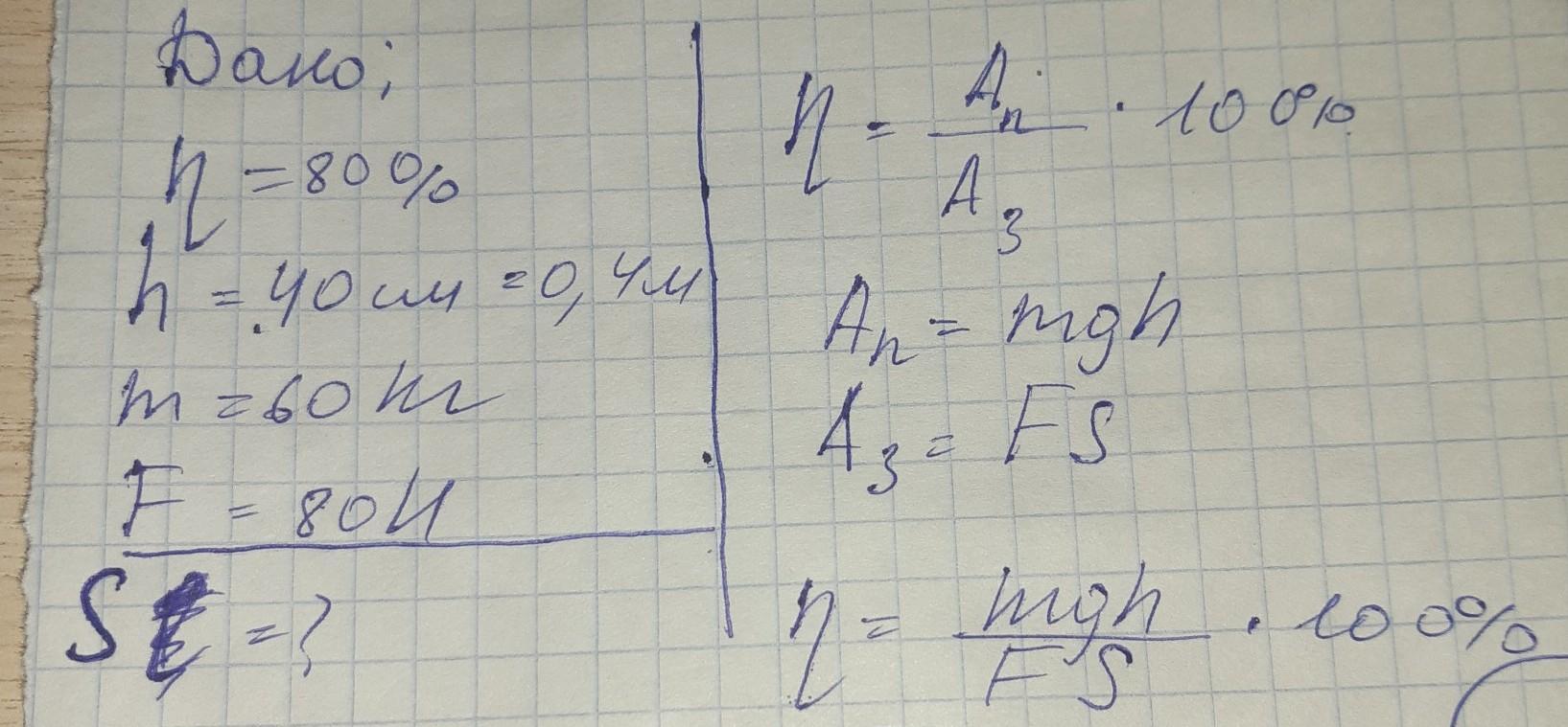 Коэффициент полезного действия наклонной плоскости n = 80 %. Определите длину наклонной плоскости, если Высота плоскости h = 40 см и для поднятия груза массой т = 60 кг требуетс прикладывать параллельно плоскости силу F = 80 Н