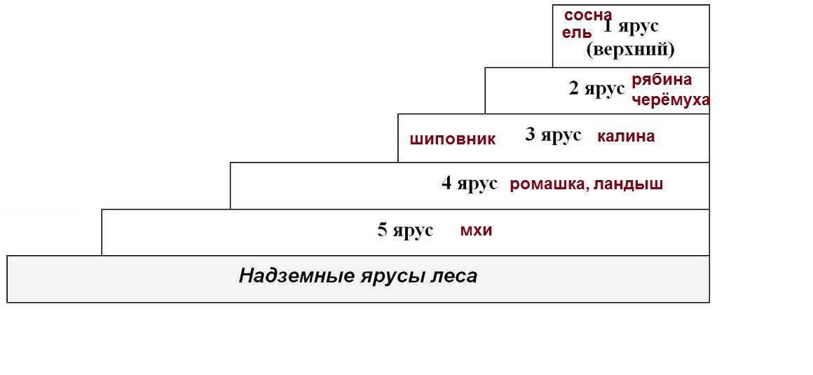 1. Соотнесите растения и надземные ярусы леса (укажите номер яруса, название растения).