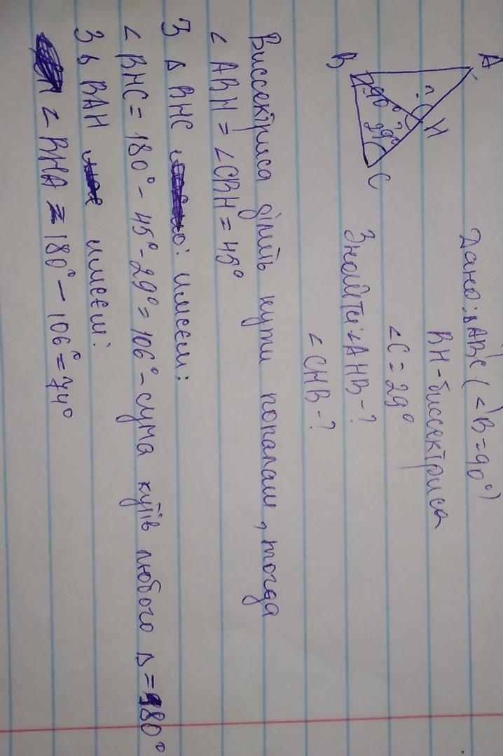 В прямоугольном треугольнике ABC <B=90°, ВН - биссектриса. Найдите углы, которые образует биссектриса ВН с катетами треугольника, если один из острых углов равен 29.
