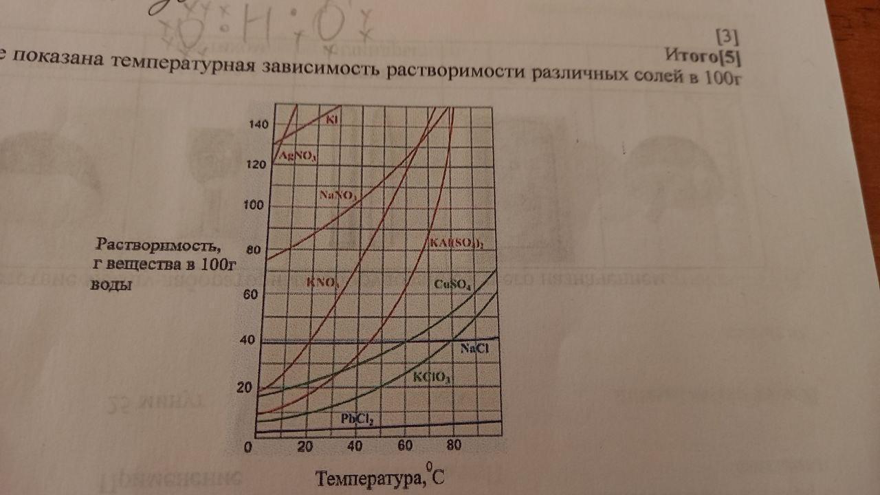 На рисунке показана температурная зависимость растворимости различных солей в 100г воды.