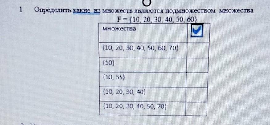 Определить какие из множеств являются подмножеством множества F = {10, 20, 30, 40, 50, 60} множества 2 {10, 20, 30, 40, 50, 60, 70) (10) (10, 35) (10, 20, 30, 40) {10, 20, 30, 40, 50, 70)