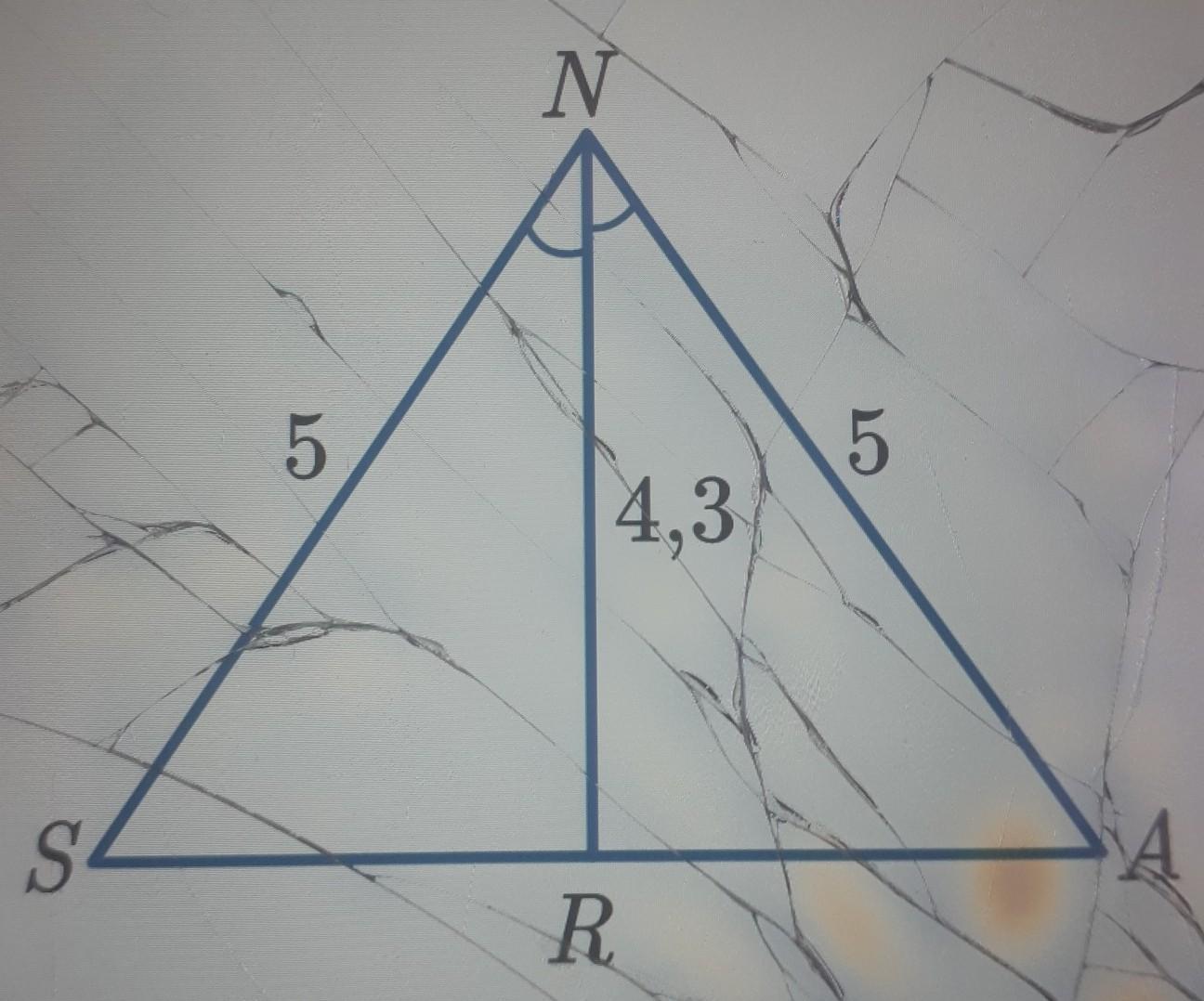 Дано: SN = NA = 5. В треугольнике SNA проведена биссектриса NR. Длина биссектрисы равна 4,3, периметр треугольника ARN равен 11,8. Найди величину угла A.