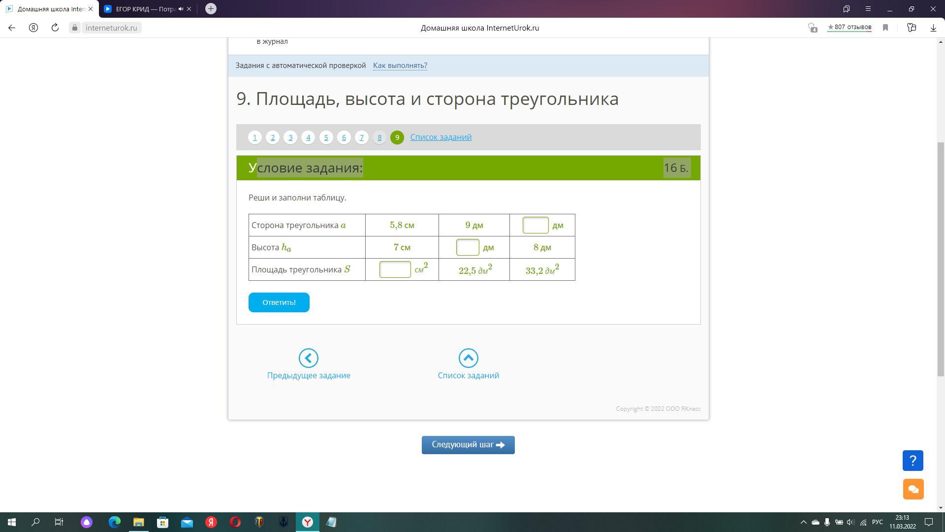 1) S = 0,5 × 5,8 × 7 = 20,3 см²
