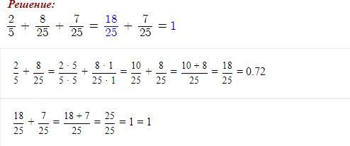 2/5 + 8/25 + 7/25 = 10 /25 + 8/25 + 7/25 = 1