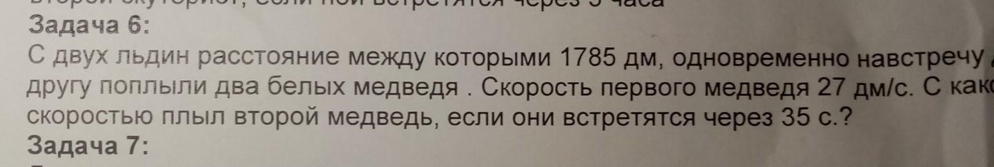 Расстояние между городами 1785 дм, одновременно навстречу друг другу поплыли два белых медведя. Скорость первого медведя 27 дм/с. С какой скоростью плыл второй медведь, если они встретятся через 35 с.?СРОЧНО!