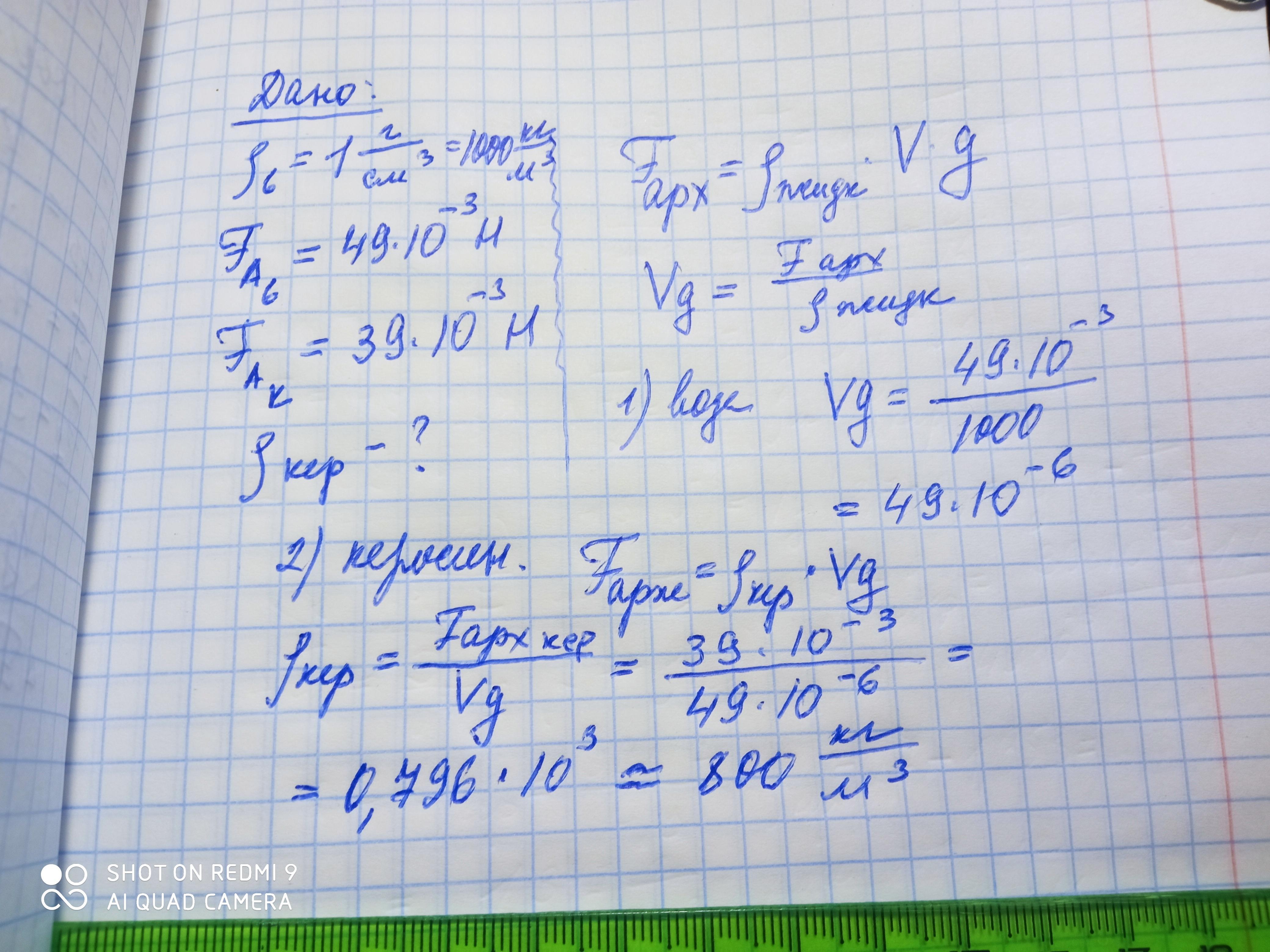 мраморная пластина при погружении в чистую воду стала легче на 49 мН, а при погружении в керосин - на 39 мН. Найди, какова плотность керосина