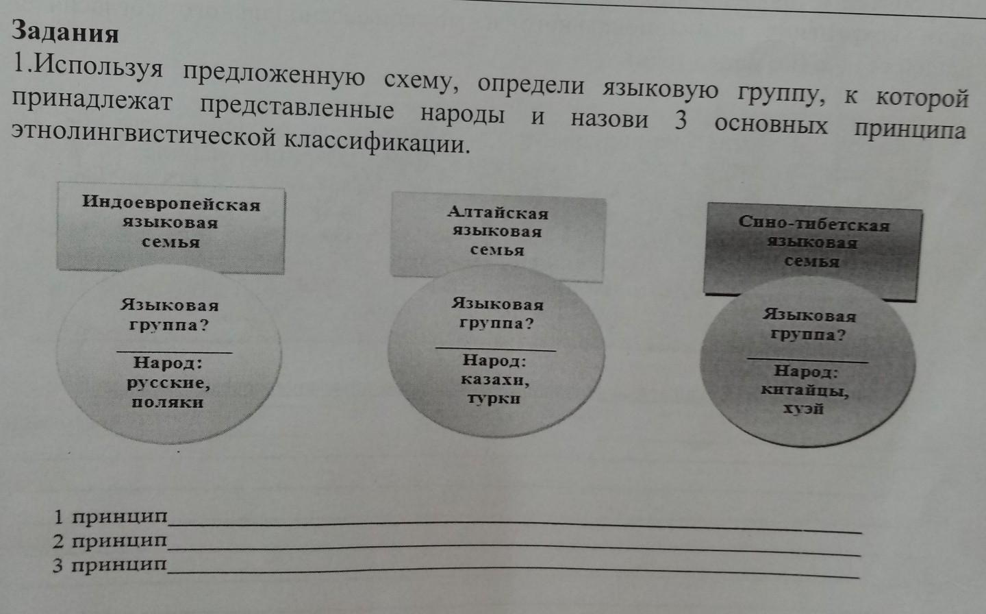Используя предложенную схему, определи языковую группу, к которой принадлежат представленные народы назови 3 основных принципа этнолингвистической классификации.