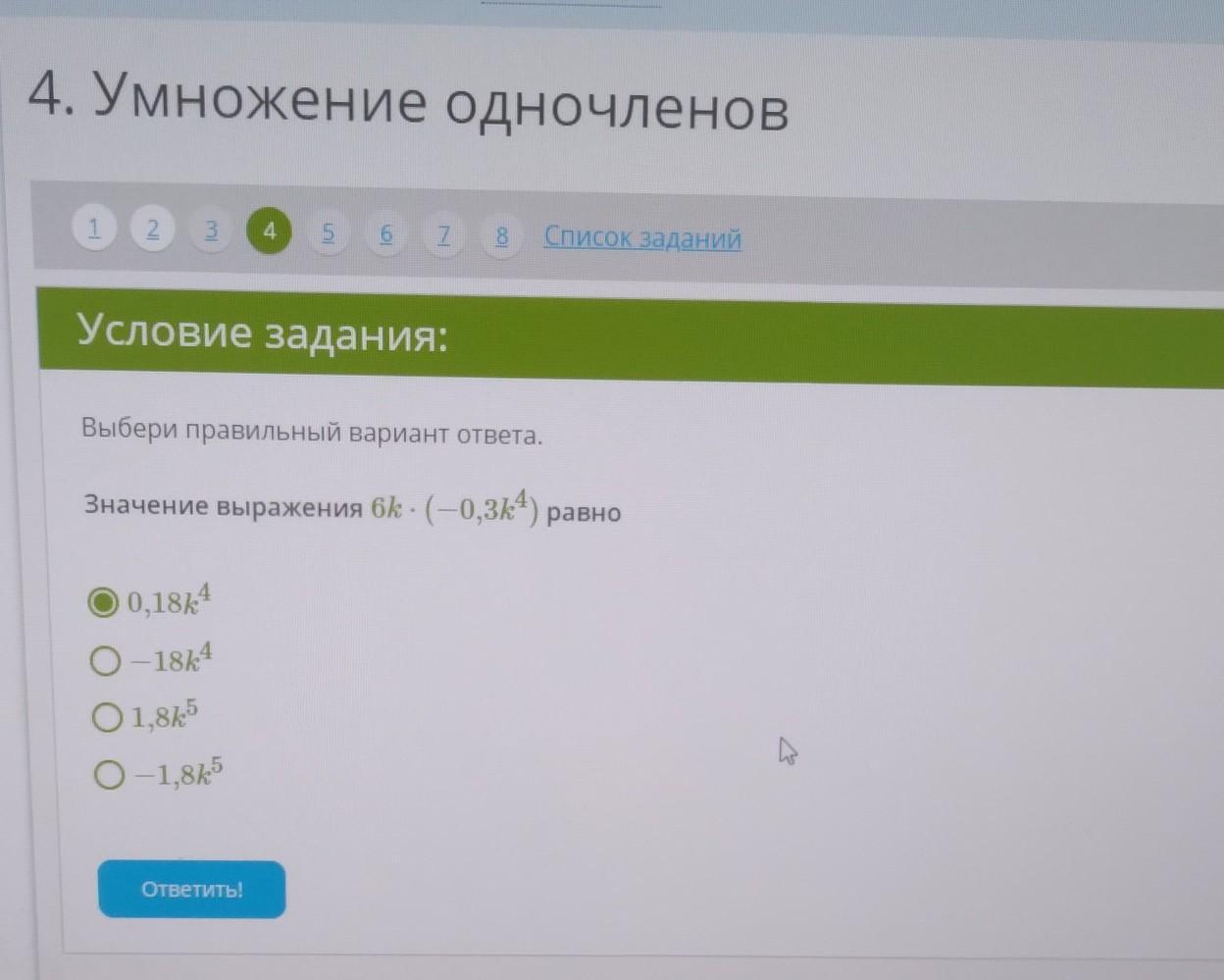 6к*(-0.3к⁴)=-1.8к⁵, показатели складываются, плюс на минус при умножении минус. числа перемножаются