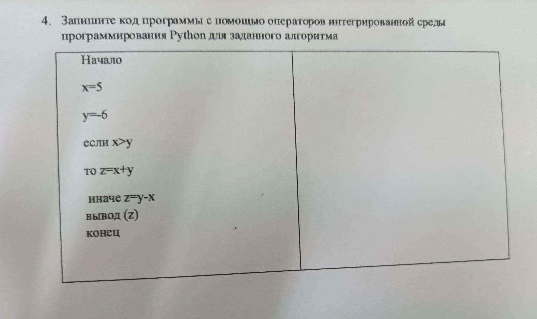 4. Запишите код программы с помощью операторов интегрированной среды программирования Python для заданного алгоритма Начало xes y-6 если у TO Zxy иначе zyx вывод (2) конец