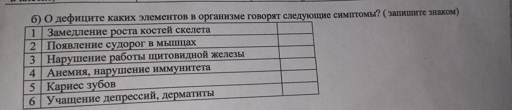 б) 0 дефиците каких элементов в организме говорят следующи 1 | Замедление роста костей скелета 2 | Появление судорог в мышцах 3 | Нарушение работы щитовидной железы 4 Анемия, нарушение иммунитета 5 | Кариес зубов 6 Учащение депрессий, дерматиты