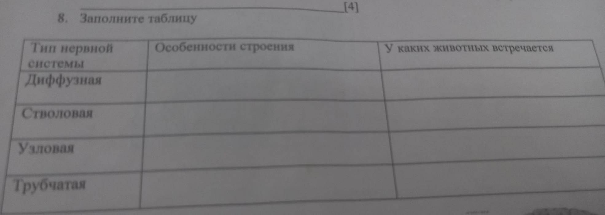 8. Заполните таблицу Особенности строения Тип нервной системы Диффузная У каких животных встречается Стволовая Узловая Трубчатая