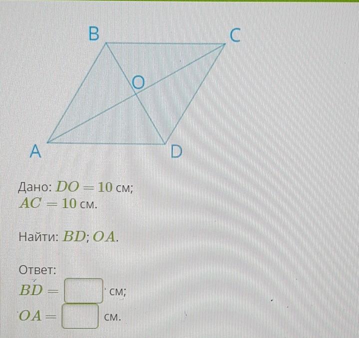 Дано: D0 = 10 см; AC 10 см. Найти: BD; ОА. Ответ: BD СМ; OA = СМ.