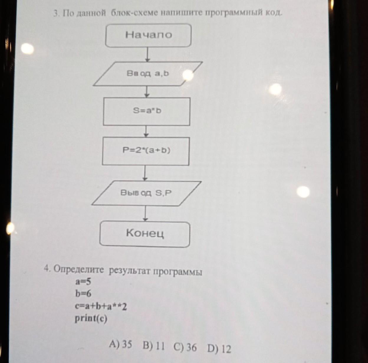 3. По данной блок-схеме напишите программный код. Начало Ввод a,b S=a"b P=2*(a+b) Вывод SP Коне